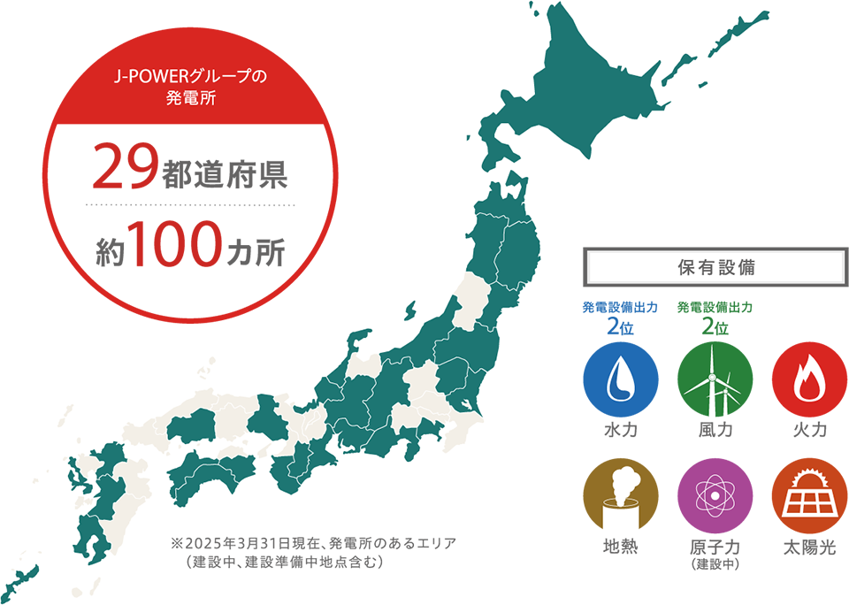 J-POWERグループは、全国に発電所を保有し、運営しています。水力、風力、地熱、太陽光、バイオマスなどの再生可能エネルギーや火力など、さまざまなエネルギーを利用して発電し、電力の安定供給を行っています。
