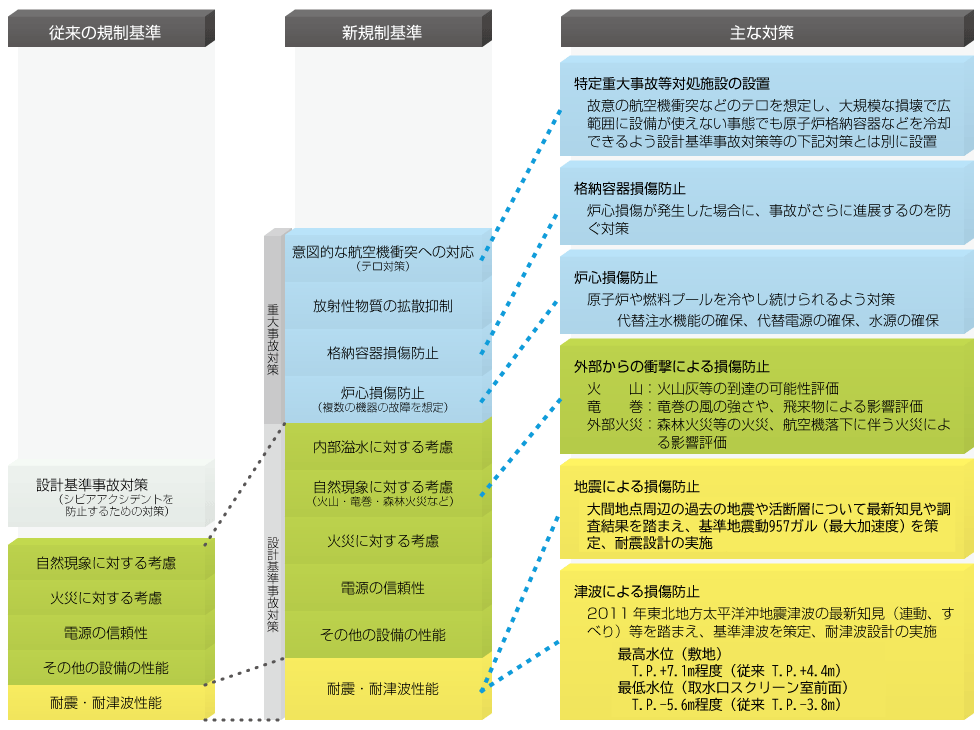 大間原子力発電所では、2013年7月に施行された新規制基準を踏まえ、地震・津波への対応強化や、重大事故等の対策としての炉心損傷防止および原子炉格納容器の損傷防止対策等を行います。また、本体施設の設計及び工事の計画の認可(設工認)から5年間の経過措置のある特定重大事故等対処施設等を含め、建設中にすべての安全対策を実施します。