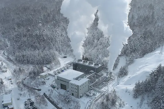 J-POWERは、三菱マテリアル(株)・三菱ガス化学(株)とともに湯沢地熱(株)を設立し、2019年5月に山葵沢地熱発電所(秋田県)の運転を開始しました。46,199kWの発電出力を持ち、出力10,000kWを超える大規模地熱発電所として、国内では23年ぶりの稼働となりました。