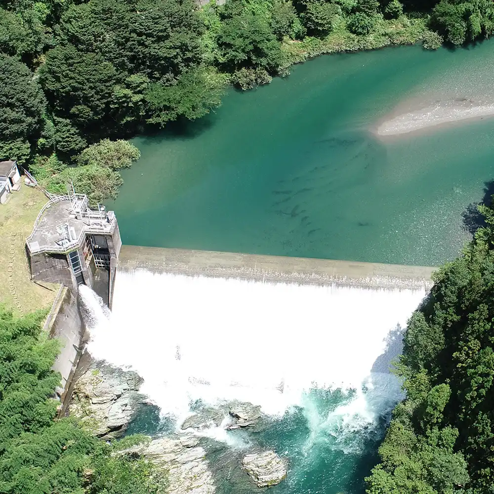 高知県本山町の汗見川に1972年完成した重力式コンクリートダムです。堤高18.5m・総貯水容量約7.9万m3で、早明浦発電所(最大出力約4.2万kW)に水が送られ発電します。吉野川の支流に位置する汗見川はとても透明度が高く、アユやアマゴのすむ清流として知られています。
