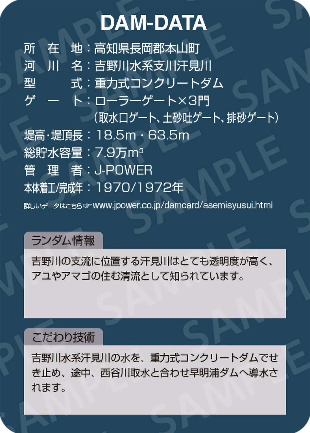 | 交通手段 | ダムへのアクセス方法大杉駅より車で約30分 ダムから配布カ所までのアクセス方法汗見取水ダムより本山町方面に車で約15分 |