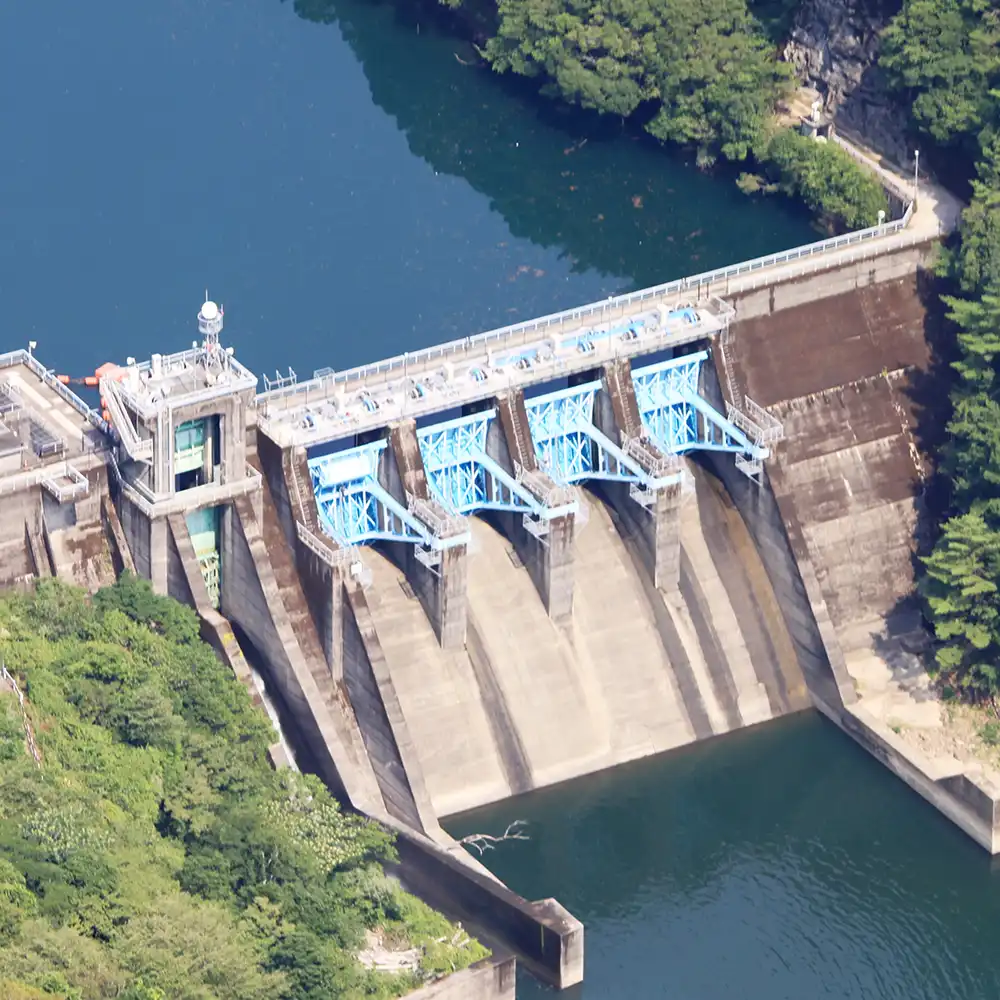 高知県北川村の奈半利川に1960年完成した重力式コンクリートダムです。堤高38m・総貯水容量約424万m3で、長山発電所(最大出力約3.7万kW)に水が送られ発電します。ダム上下流のあちらこちらで柚子が栽培されており、収穫期の11月頃は村全体が柚子の香りに包まれます。