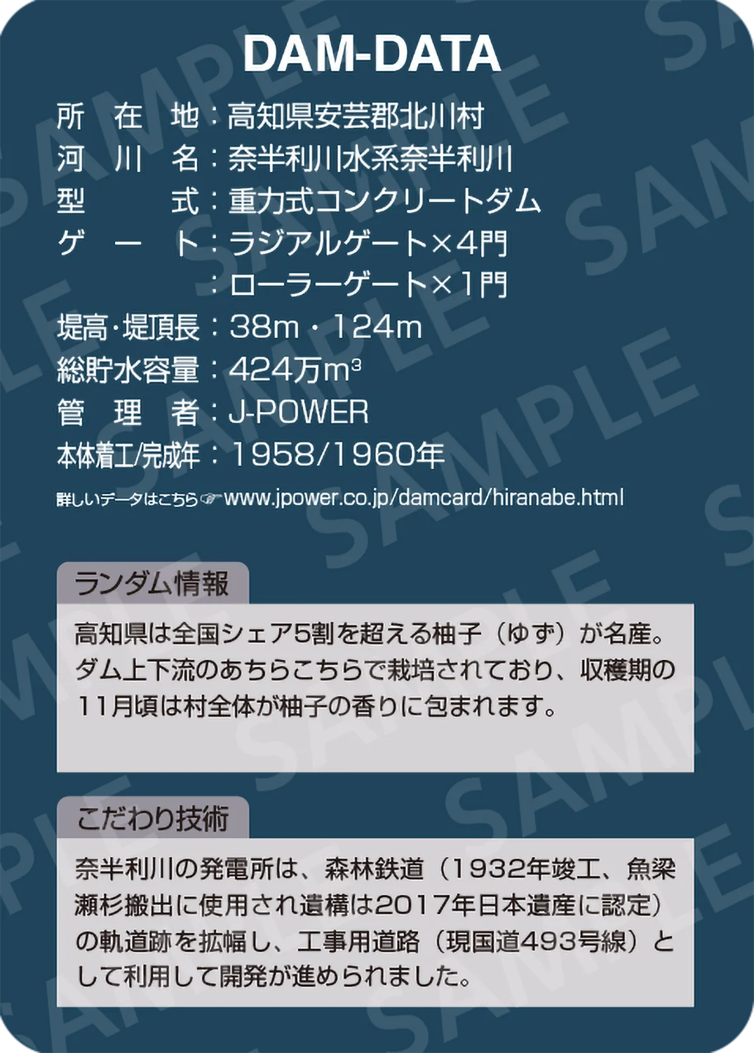 | 備考 | 事務所受付に声をかけて下さい。 山道でカーブが多く落石も多いため、ダムへお越しの際は走行速度に注意して下さい。 ダムと配布箇所が離れていますので、ダムカードの受取りの際はダムに行った証明(写真等)の提示をお願いします。 |