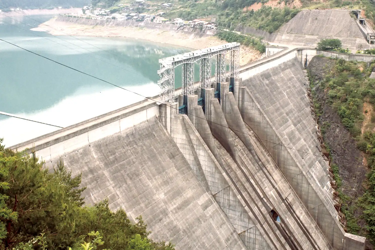 奈良県十津川村の熊野川に1960年完成した重力式コンクリートダムです。堤高101m・総貯水容量約1.3億m3で、十津川第一発電所(最大出力約7.5万kW)に水が送られ発電します。ダム上流には吊橋で名高い「谷瀬の吊橋」があります。