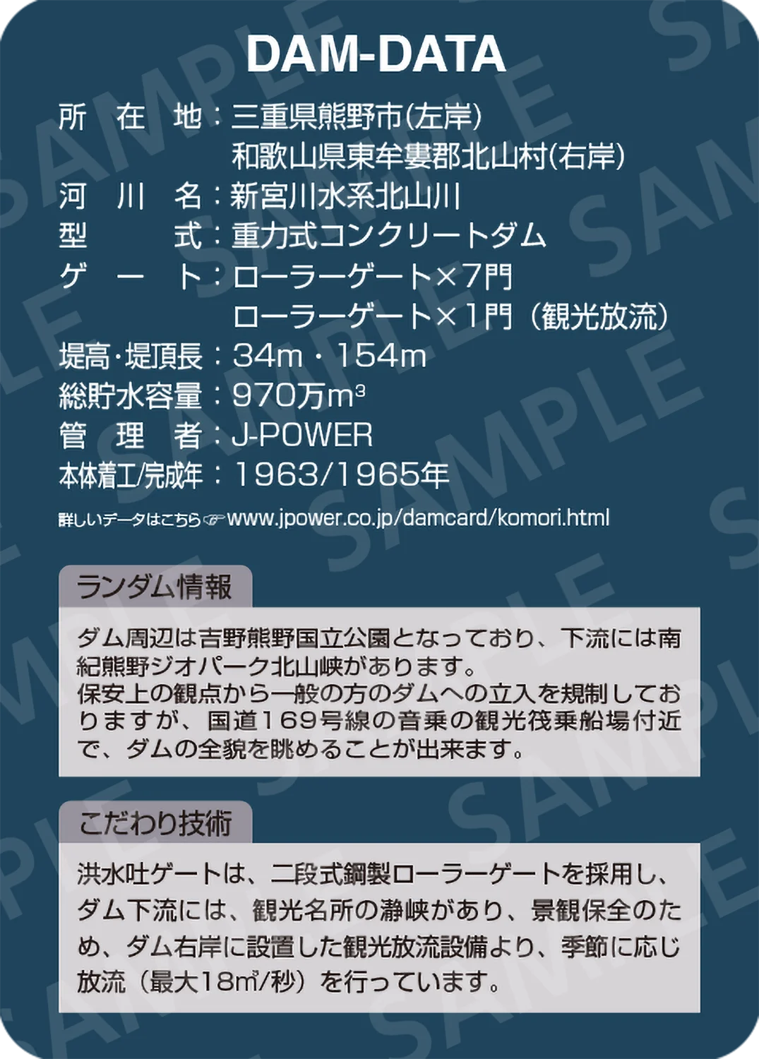 | 備考 | ダムカードは、ダムを訪れた方にお一人様一枚お渡ししております。 ダムと配布箇所が離れていますので、ダムカードの受取りの際はダムに行った証明(写真等)の提示をお願いします。 |