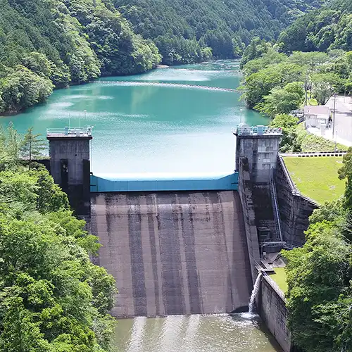 三重県尾鷲市の又口川およびクチスボ谷川他に1961年完成した直線重力式コンクリートダム+左岸取付部コンクリート心壁型アースダムです。堤高35m・総貯水容量約196万m3で、尾鷲第二発電所(最大出力約2.5万kW)に水が送られ発電します。中部地方では珍しいカタカナ名のダムです。