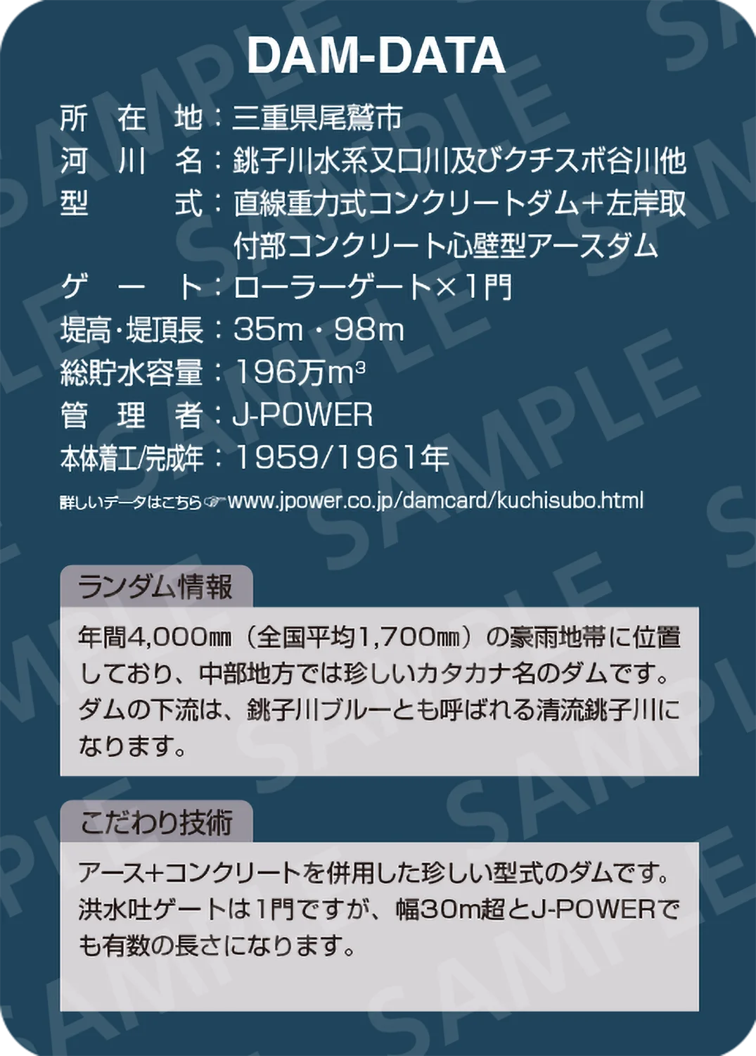 | 備考 | ダムカードは、ダムを訪れた方にお一人様一枚お渡ししております。 ダムと配布箇所が離れていますので、ダムカードの受取りの際はダムに行った証明(写真等)の提示をお願いします。 |