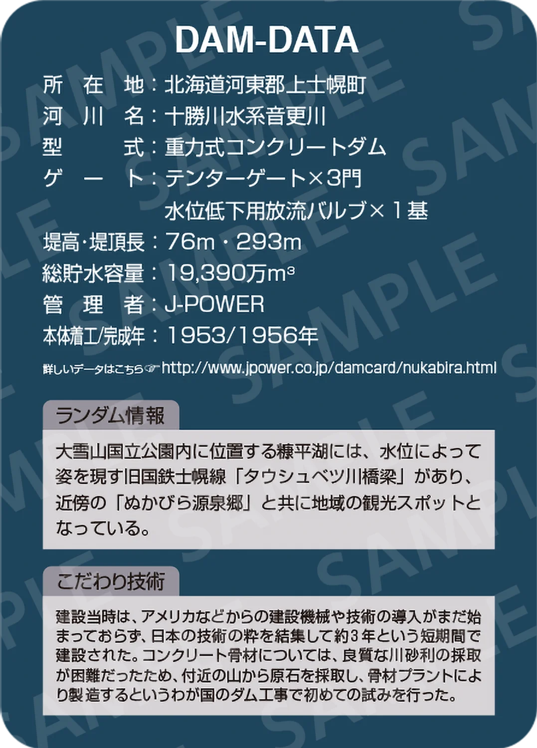 | 備考 | ダムカードは、ダムを訪れた方にお一人様一枚お渡ししております。ご希望の方は、ひがし大雪自然館の案内カウンターまでお越しください。 ・配布の際、簡単なアンケートにご協力ください。 ・郵送等での配布は行っておりません。また、在庫状況により、配布できない場合もございますので、ご了承ください。 |