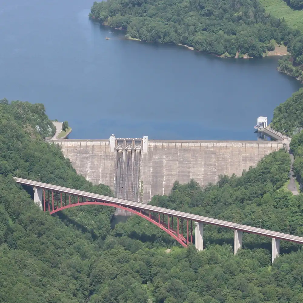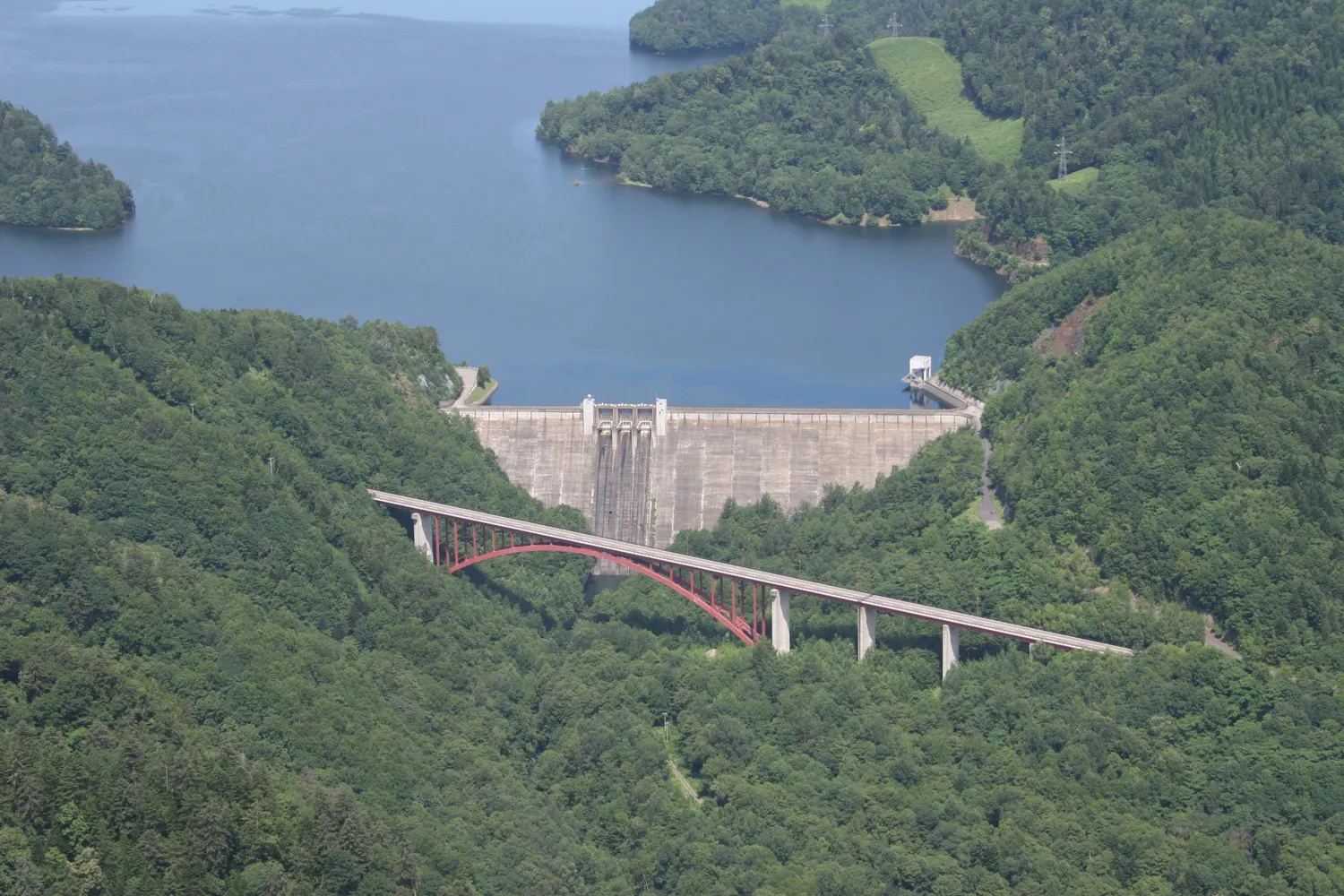 北海道上士幌町の音更川に1956年完成した重力式コンクリートダム。堤高76m・総貯水容量約19,390万m3と大規模で、下流の糠平発電所(出力約4.4万kW)へ送られ発電に利用しています。ダム湖「糠平湖」には水位によって姿を現す「タウシュベツ川橋梁」があります。