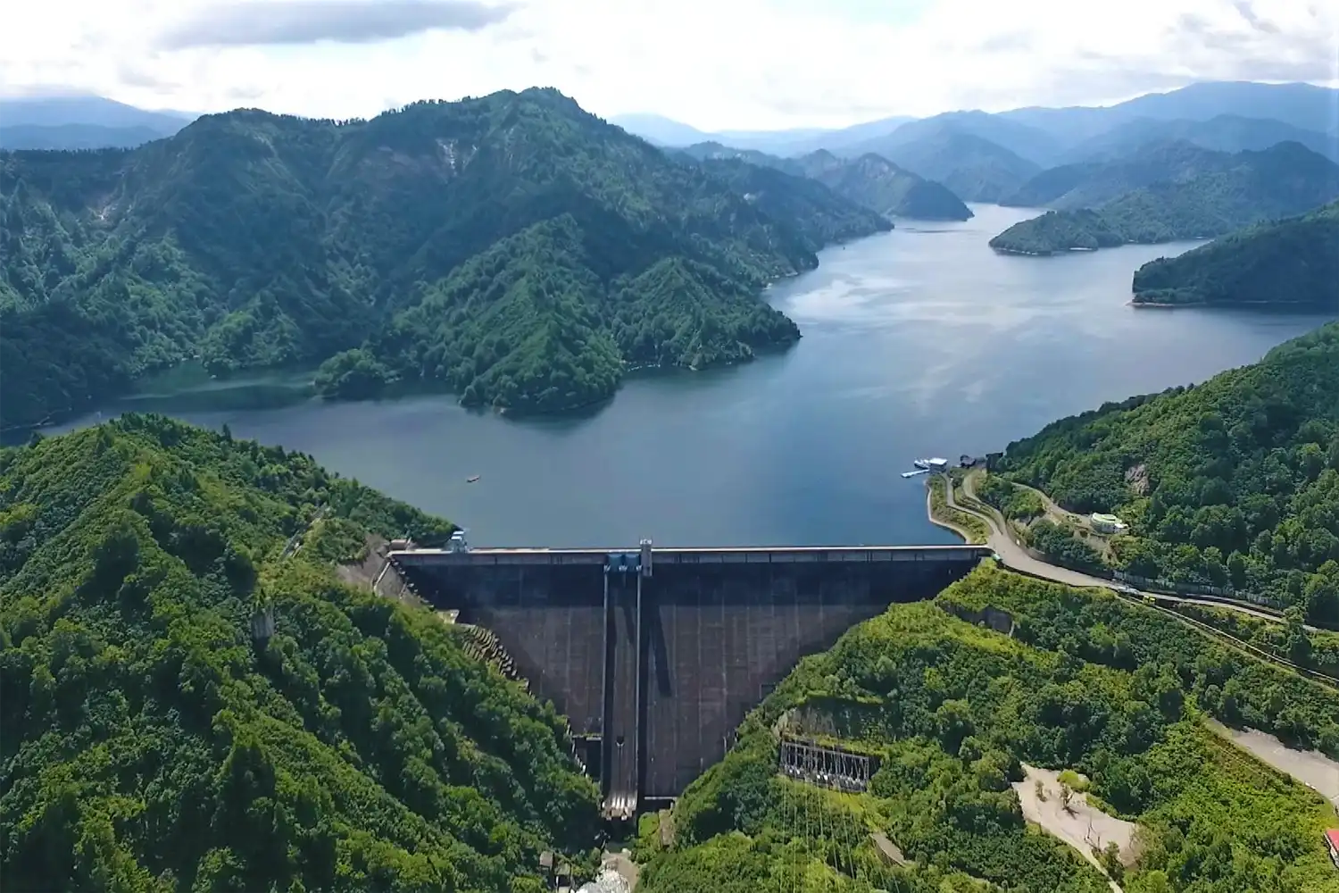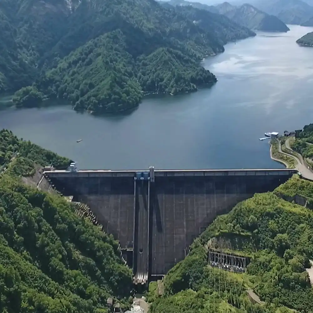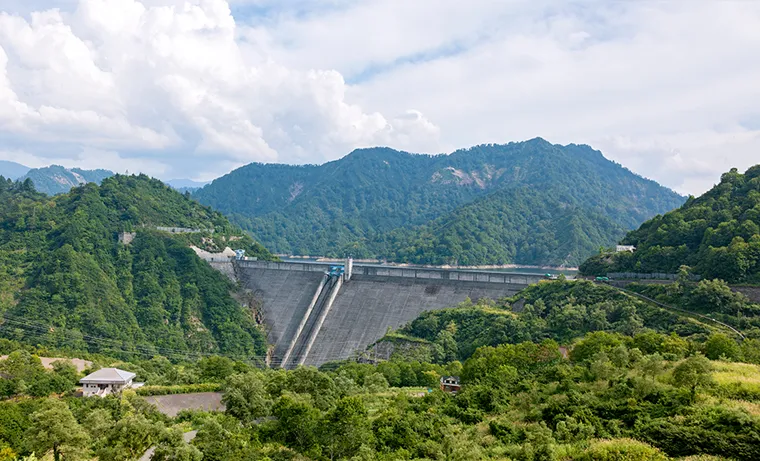 新潟県魚沼市と福島県檜枝岐村の只見川に1960年完成した重力式コンクリートダムです。堤高157m・総貯水容量約6億100万m3で、下流の奥只見発電所(最大出力約56万kW)に水が送られ発電します。奥只見湖は貯水容量最大級で遊覧船も運航しています。