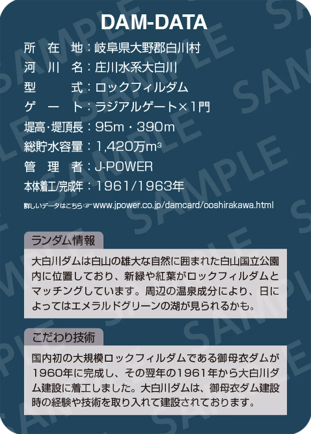 | 配布に関する注意事項 | ・県道451号線(県道白山公園線)の交通情報は岐阜県 道の情報または白川村役場ウェブサイトでご確認ください。 ・ダムカードの配布は一人一枚となっております。白水湖畔ロッジでの手渡しのみとし、郵送、トヨタ自然學校での受け取りなどの他の方法での配布は行っておりません。在庫状況により、配布できない場合もございますので、ご了承ください。 |