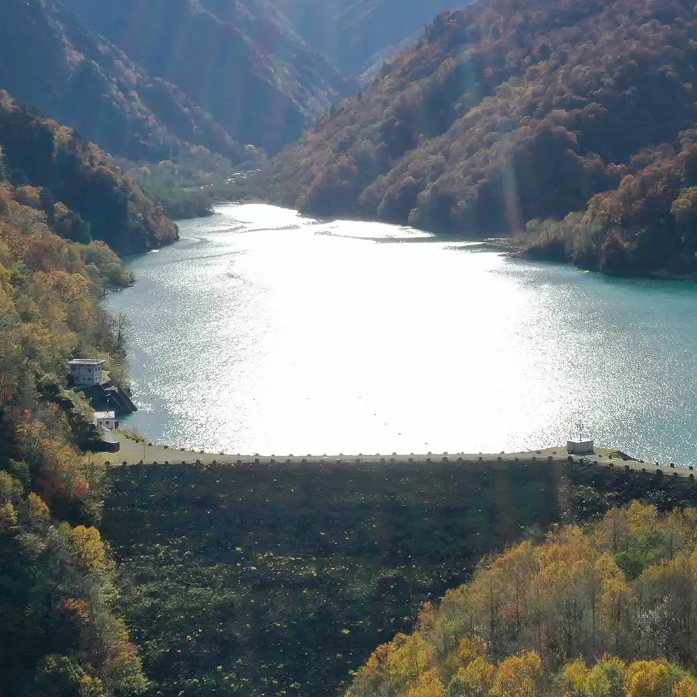 岐阜県白川村の大白川に1963年完成したロックフィルダムです。堤高95m・総貯水容量約1420万m3で、御母衣第二発電所(最大出力約5.92万kW)に水が送られ発電します。大白川ダムは、御母衣ダム建設時の経験や技術を取り入れて建設されております。