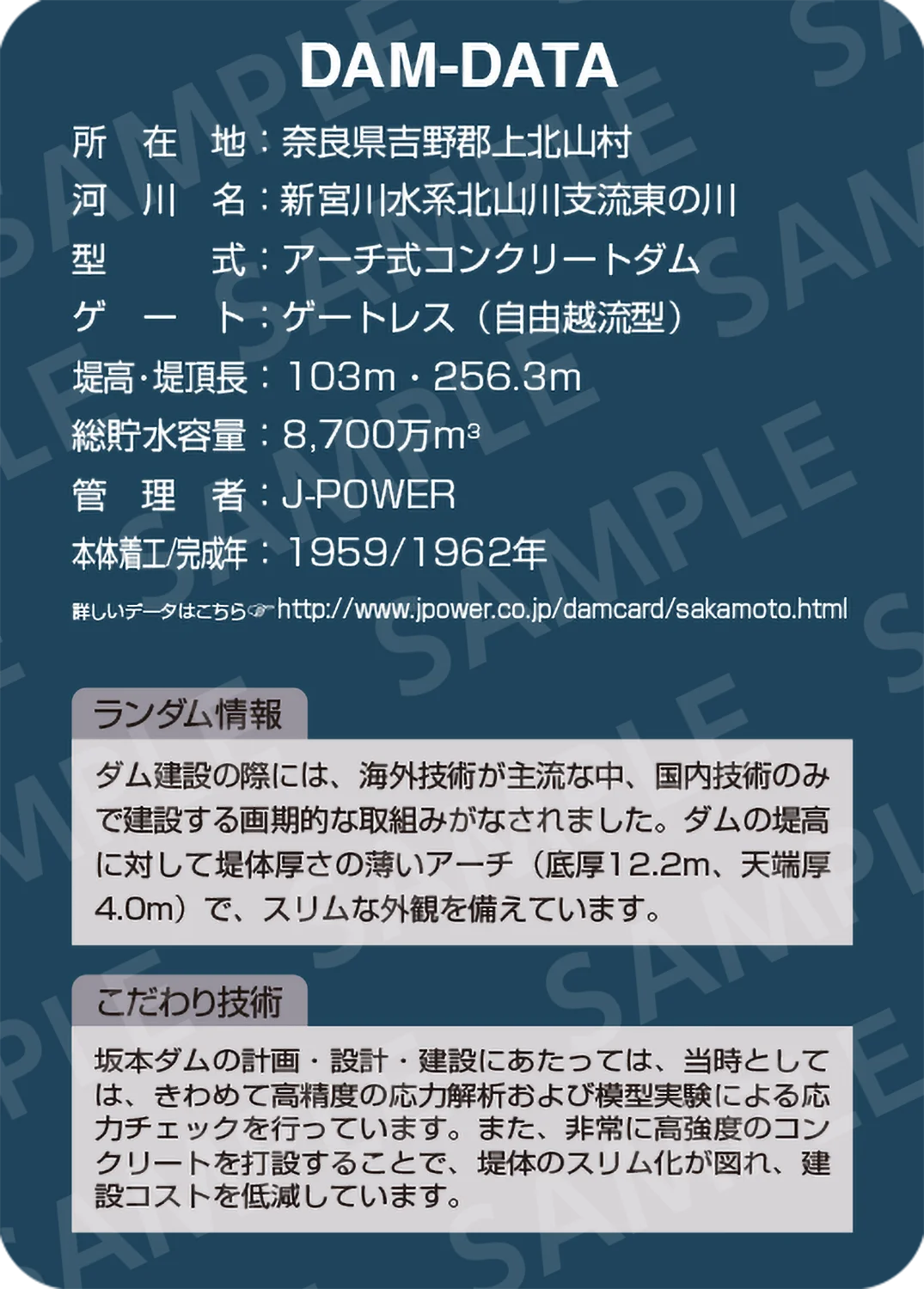 | 備考 | ダムカードは、ダムを訪れた方にお一人様一枚お渡ししております。 ダムと配布箇所が離れていますので、ダムカードの受取りの際はダムに行った証明(写真等)の提示をお願いします。 |