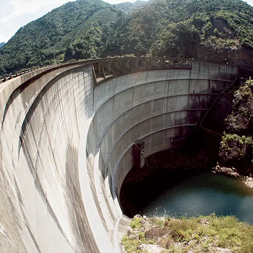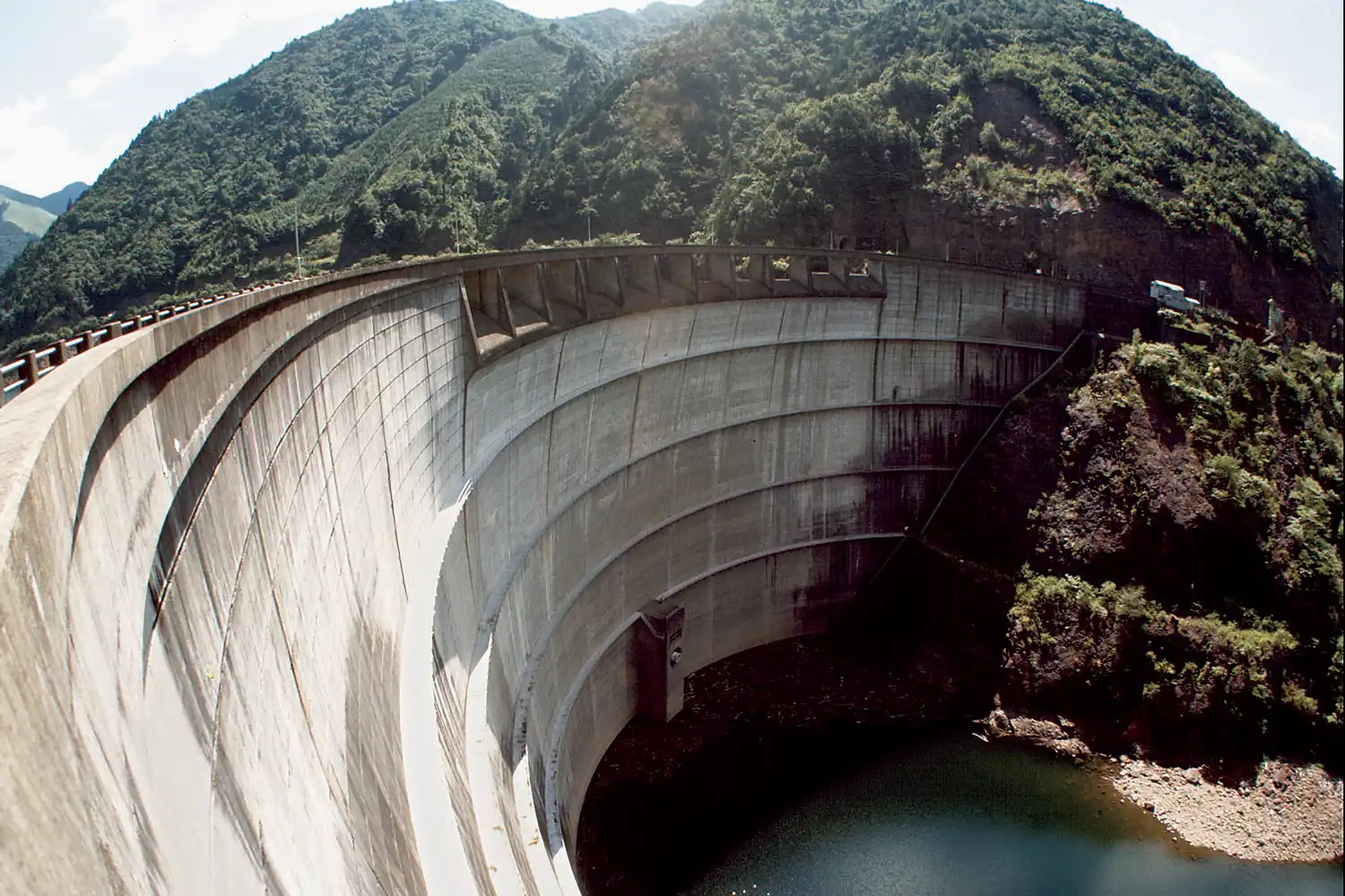 奈良県上北山村の北山川に1962年完成したアーチ式コンクリートダムです。堤高103m・総貯水容量約8700万m3で、尾鷲第一発電所(最大出力約4.0万kW)に水が送られ発電します。ダム建設の際には、海外技術が主流な中、国内技術のみで建設する画期的な取り組みがなされました。
