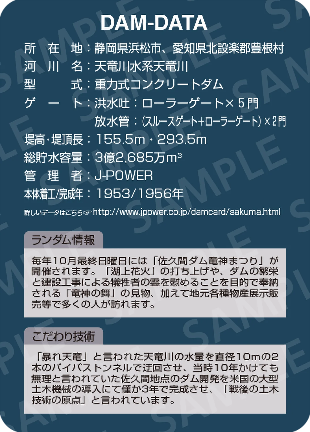 | 備考 | ダムカードご希望の方は、佐久間電力館の1階玄関の受付にて館員に声をお掛けください。 ダムカードの配布は一人一枚となっております。 |