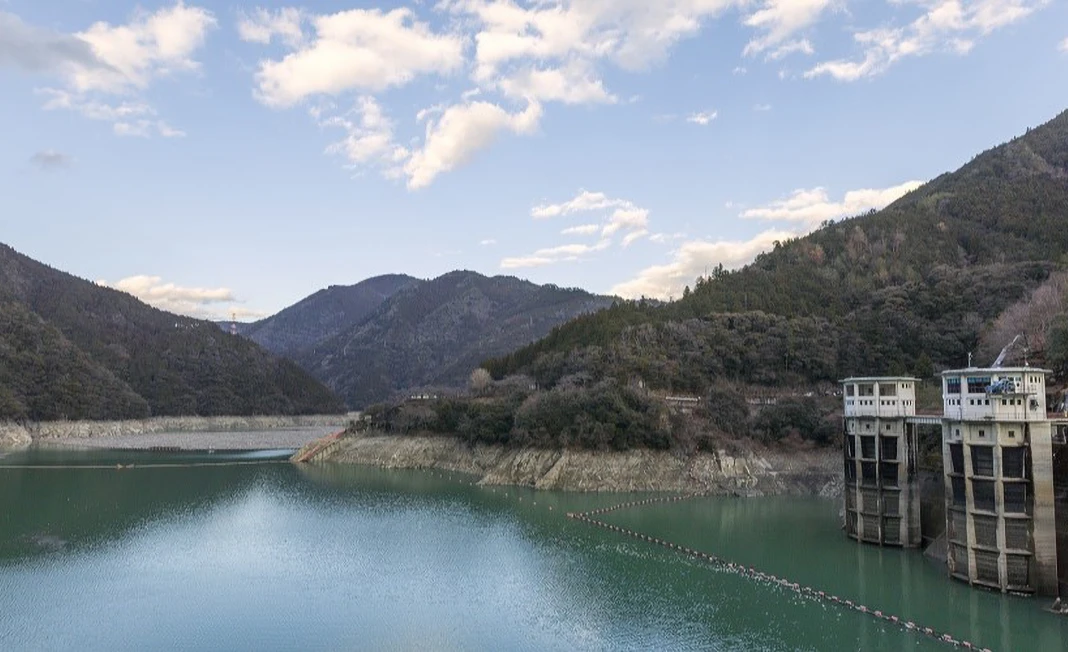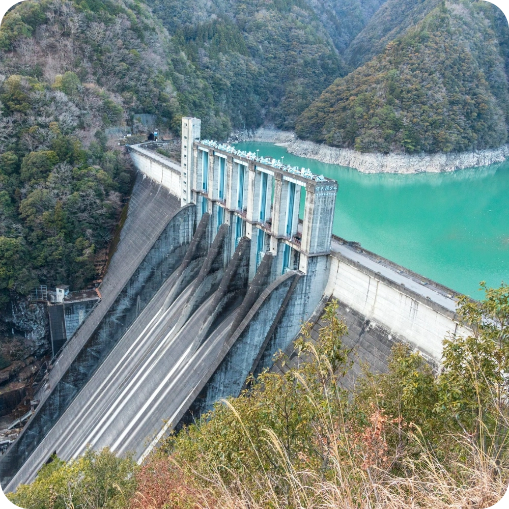 静岡県浜松市と愛知県豊根村の天竜川に1956年完成した重力式コンクリートダムです。堤高155.5m・総貯水容量約3億2,685万m3で、佐久間発電所(最大出力約35万kW)に水が送られ発電します。毎年10月最終日曜日には「佐久間ダム竜神まつり」が開催されます。