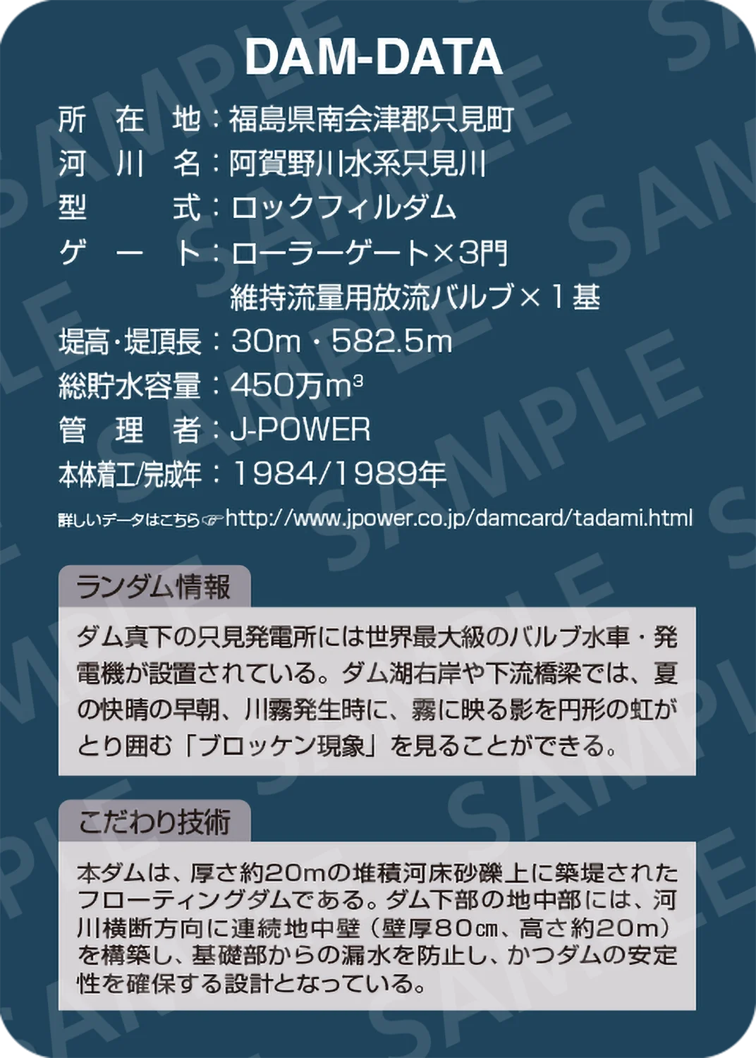 | 備考 | ダムカードはダムをご覧になった方に一人一枚お配りしております。 原則、只見展示館で配布しておりますが、休館日は下記の場所で配布しております。 毎週水曜日及び冬季:只見町インフォメーションセンター お問合せ先:J-POWER 田子倉電力所 0241-82-2251 (土日祝日を除く9:00~16:00まで) |