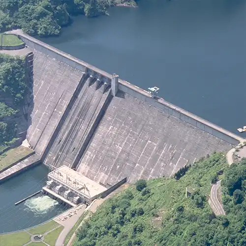 福島県只見町の只見川に1959年完成した重力式コンクリートダムです。堤高145m・総貯水容量約4億9400m3で、下流の田子倉発電所(最大出力約40万kW)に水が送られ発電します。田子倉湖では遊覧船が浮かび紅葉等が楽しめます。