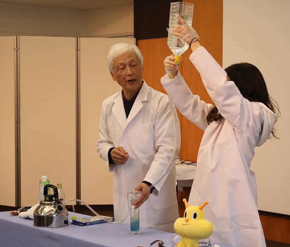ドクターによるCCS実験では、CO2をどのように回収し地中に埋設するのかCCSの仕組みを解説し、実際にCO2を回収し、回収したCO2を地下に埋める方法を簡易的に実演していただきました。