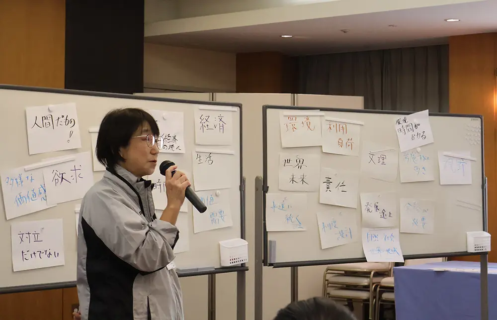 ディベート形式で一見対立する経済と環境について、本当に両立できないのか、どうしたら両立できるのか自分の考えを発表しました。他の参加者の意見に触れ、新たな視点や気付きを得た参加者が多くいました。