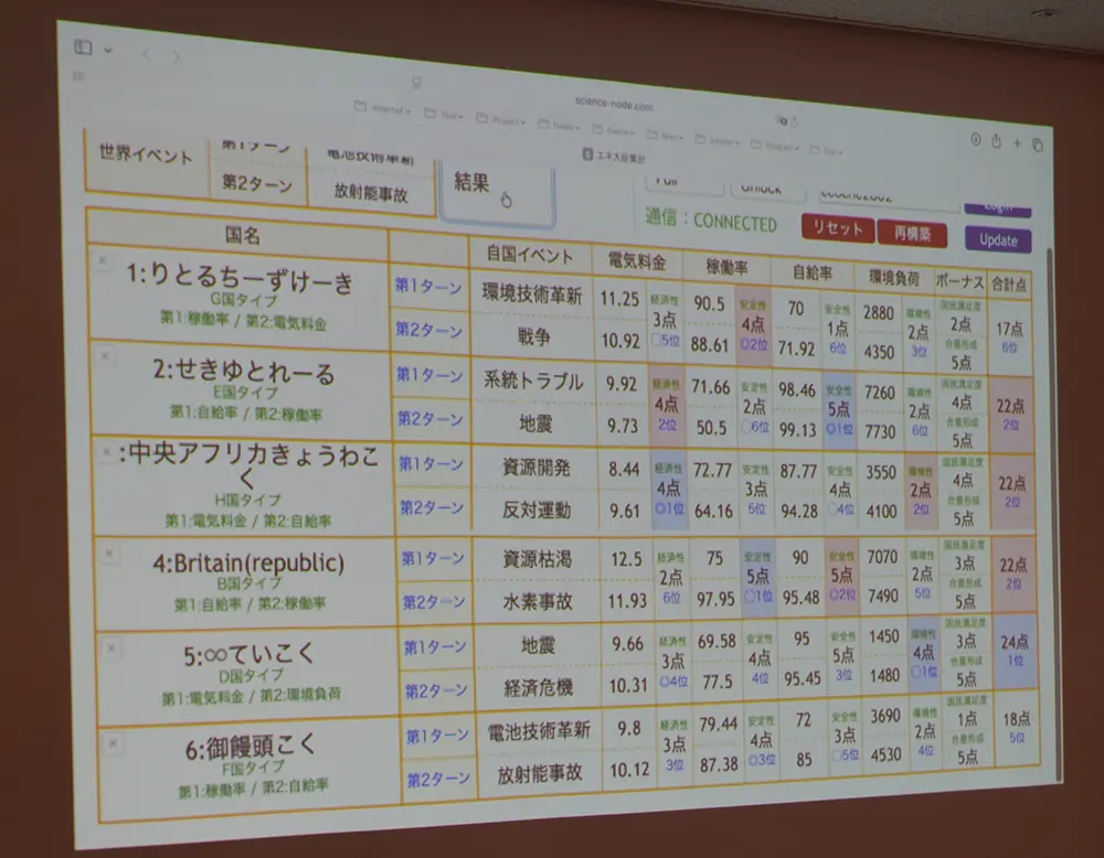 「エネルギー大臣になろう!」の後半戦スタート!世界イベントでは「放射能事故」が発生しましたが、原子力発電所をたくさん建てたチームは果たして・・・結果は「∞ていこく」が優勝しました!エネルギーミックスの難しさを痛感しました。