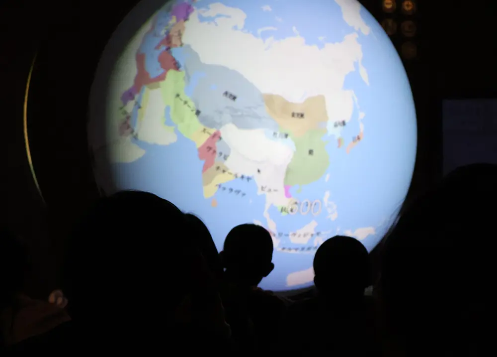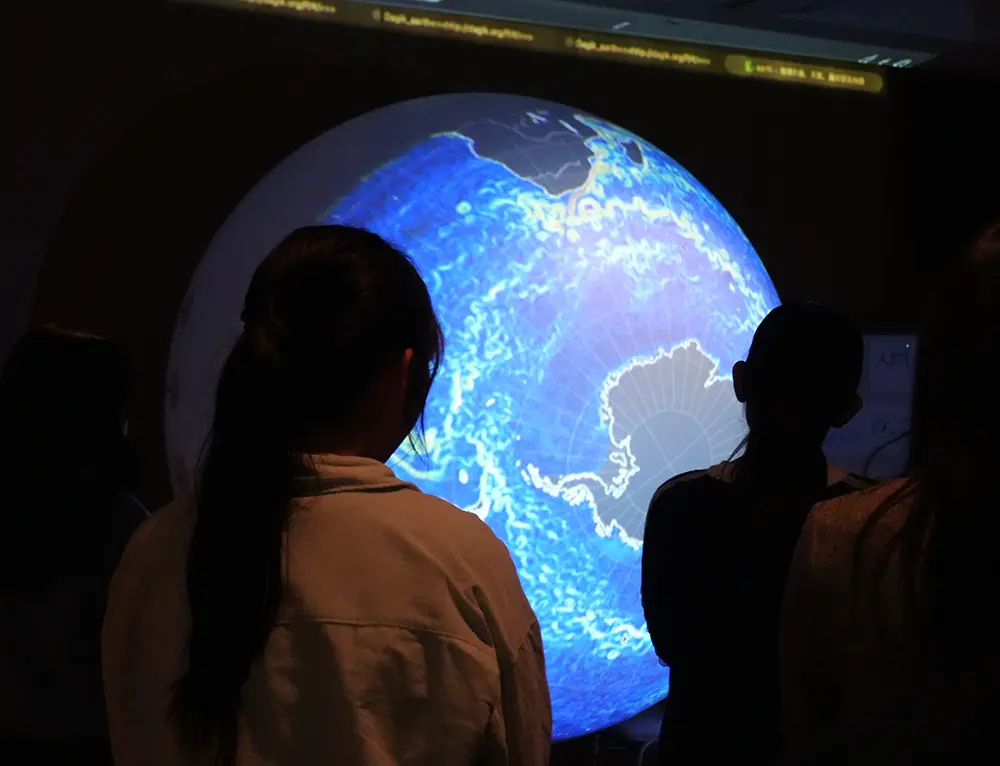 球体のスクリーンに地球を投影する「ダジックアース」をサイエンスカクテルの岩城氏(キャンプネーム:イワクニ)解説のもと体験しました。人類の誕生から現代までの歴史を辿ったり、CO2の排出状況を表示させたりして、地球全体が抱える問題を俯瞰して見ることができました。