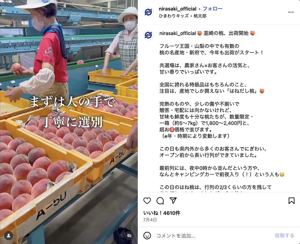 これは、桃の産地として知られる山梨県韮崎(にらさき)市の公式インスタグラムに投稿されたリール動画(※1)。カメラは生産者の笑顔や声も捉え、わずか数十秒の映像に桃の瑞々しさや、この土地が醸し出す温かさが凝縮されている。公開されると50万回以上も再生され、県内外から多くの人が訪れるようになったという。