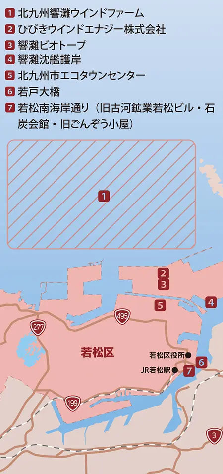 J-POWERを含む5社が出資した北九州響灘(ひびきなだ)洋上ウインドファームは福岡県北九州市にある。埋め立て地にリサイクル事業を誘致し、次世代エネルギーにも力を入れるエコの町を歩く。