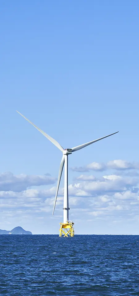 土台が黄色の風車が同社のものだと聞き、海に浮かぶ黄色に視線を向ける。白い風車は優雅で美しく、北九州の新しい風景を前に胸が高鳴った。