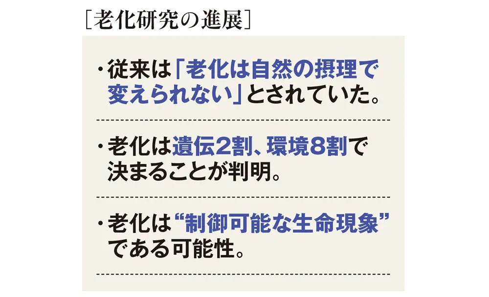 「一卵性双生児を対象にした研究から、老化の進行において遺伝が関与する割合は20%程度にすぎないと考えられるようになってきました。残りの80%は、生活習慣や居住環境といった『環境因子』によって左右されているということです。もし老化が遺伝子によって決められているのであれば、外から変えることは困難を極めるでしょう。しかし、環境因子が大きく関わっているのであれば、老化は制御可能な生命現象だと考えることができます。こうした認識の転換が、老化研究を大きく加速させたのです」