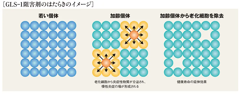 「老化細胞は、GLS-1という酵素を使ってグルタミンというアミノ酸を分解しますが、その過程でアンモニアが生じます。アルカリ性であるアンモニアには、酸性状態を中和する働きがある。つまり、老化細胞は自らの内部環境を中和することで死を免れていたのです」