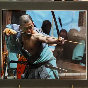 お弓祭りはその年の五穀豊穣や無病息災、家内安全を祈願する新春の行事である。主(おも)川と谷(たに)川に分かれ、それぞれ6人の射手たちが弓で的を射て得点を争うのだが、なんと12人で合計1,008本の矢を放つ。