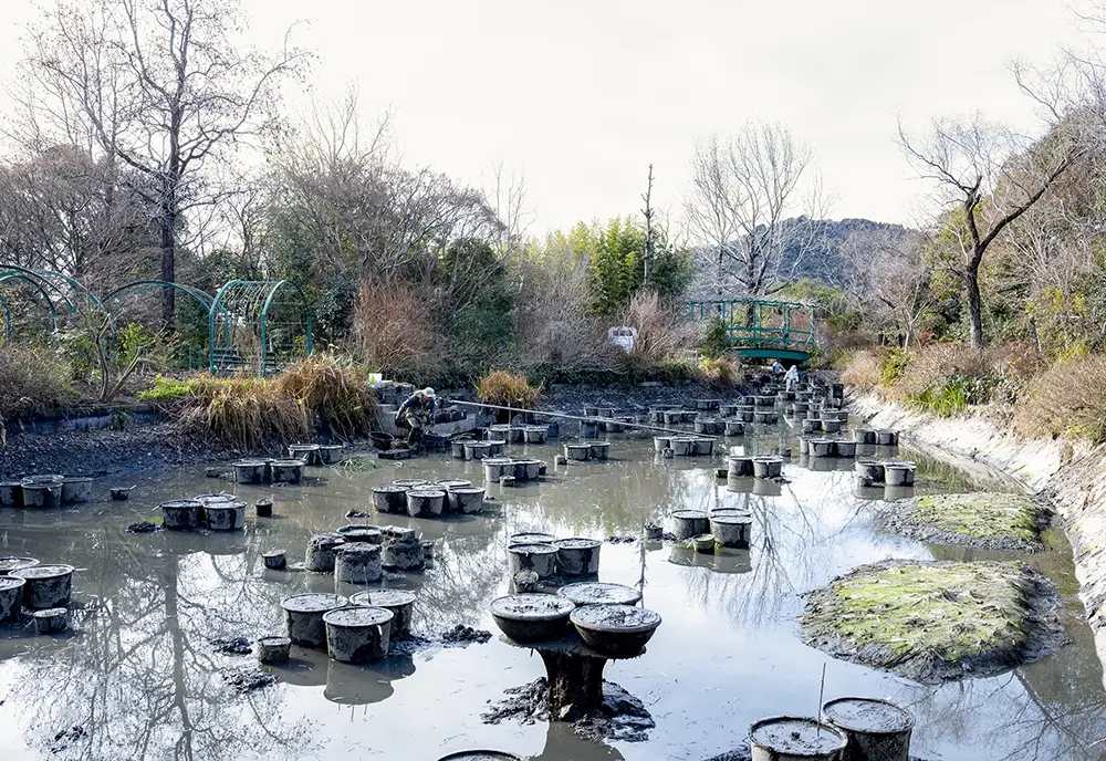 訪れた日は冬季休園の時期にあたり、園内では「水の庭」の池の水が抜かれ、睡蓮の株分けが行われていた。鉢いっぱいに株が大きくなると成長が妨げられるため、年に一度花つきを良くするように植え替えを行う。