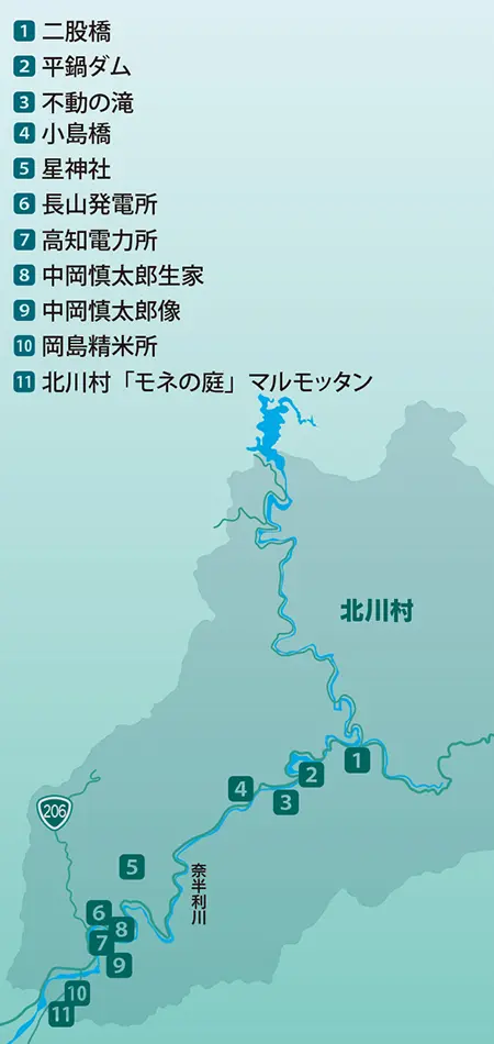 明治から昭和にかけて、北川村を含む魚梁瀬(やなせ)地区は日本を代表する杉の産地だった。山から切り出した木材は奈半利川に流して太平洋まで運んでいた。1911年に魚梁瀬森林鉄道が開通し、木材の運搬に川が使われることはなくなったが、それまではこの川が地域の経済を支えてきた。