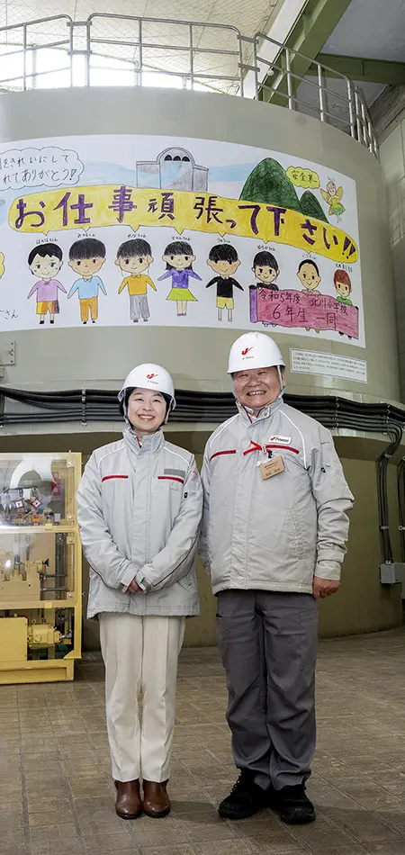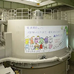 新しくなった1、2号機の発電機には、更新時に北川小学校の6年生だった子どもたちからの応援メッセージが飾られていた。