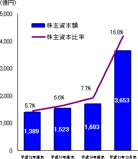 コストダウンによる利益の蓄積のほか、第三者割当増資、業務用設備流動化、設備投資圧縮、有利子負債低減等を行った結果、平成12年度末(第三次革新計画実施前)の連結株主資本比率5.7%が、平成15年12月末で16.8%にまで改善しています。
