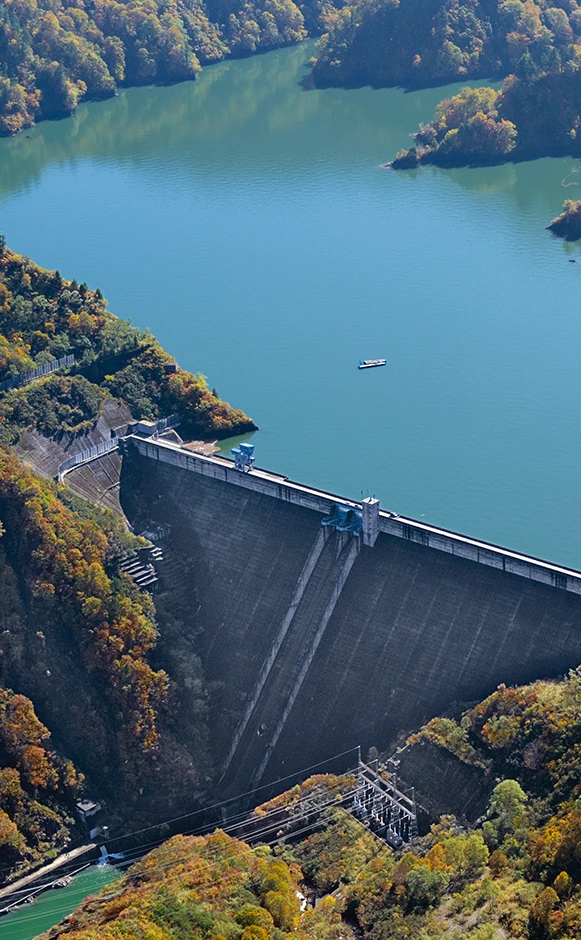 約6億m3もの豊かな水を湛えています。発電所の最大発電出力56万kWは、一般水力発電として今でも日本一の規模を誇ります。