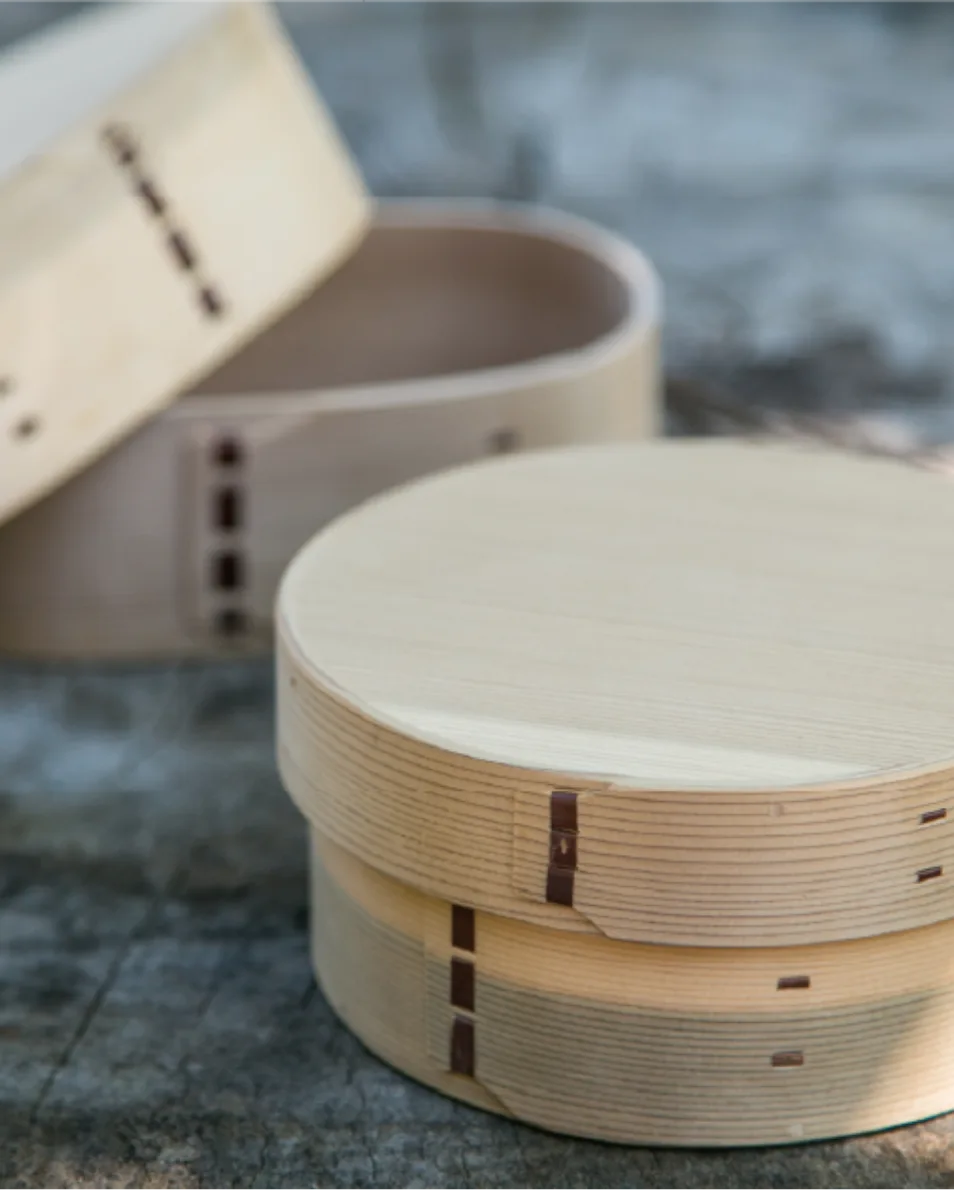 桜の皮で縫い止めた曲げわっぱは手になじみやすく、