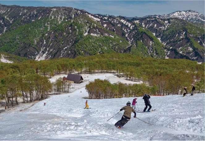 春は新緑と残雪の鮮やかなコントラスト、