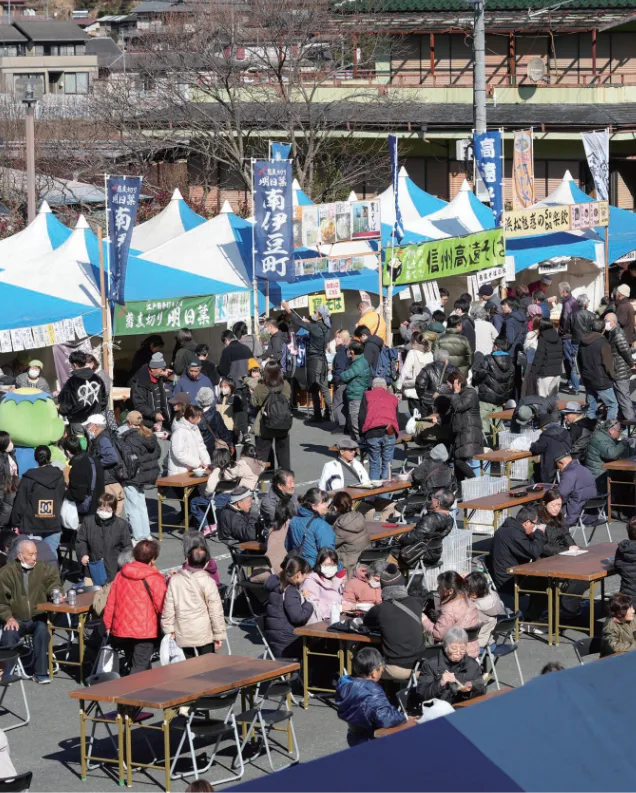そば打ちの実演や佐久間の特産品が並ぶブースもにぎわい、食の恵みを存分に楽しめます。