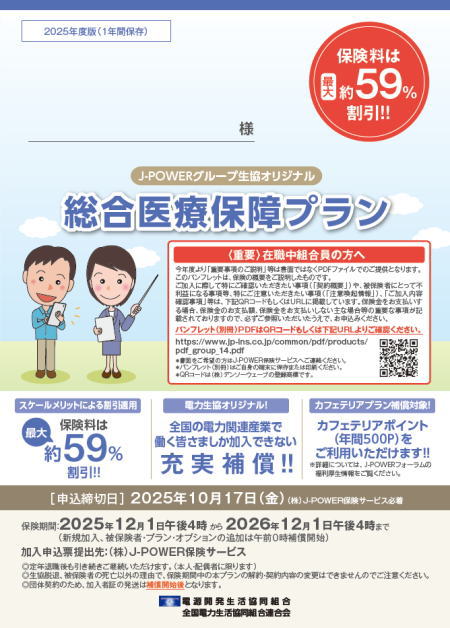 毎年9月ごろ、J-POWERグループ生協ご加入者様を対象にパンフレット及び申込用紙を配布しておりますので